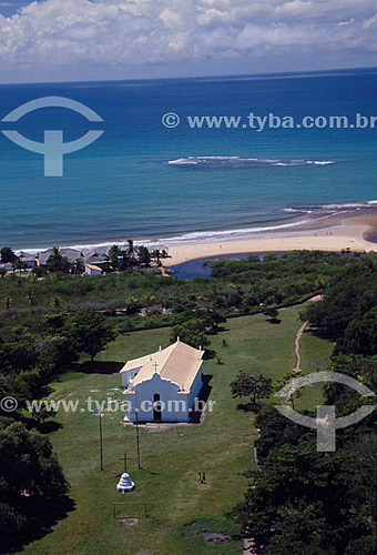 Vista aérea da Igreja de São João Batista (1586, século 16) situada na praça conhecida como "Quadrado" com a praia ao fundo - Trancoso (1) - Porto Seguro (2) - BA - Brasil (1) A cidade foi fundada em 1586 pelos Jesuítas como Aldeia São João Batista dos Índios. (2) A área denominada Costa do Descobrimento (Reserva da Mata Atlântica) é Patrimônio Mundial pela UNESCO desde 01-12-1999 e nela estão localizadas 23 áreas de proteção ambiental na Bahia (incluindo Porto Seguro). - Porto Seguro - Bahia - Brasil