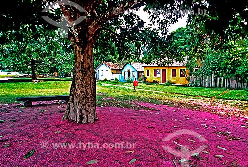 Assunto: Detalhe de flores de jambo no chão e Casario do Quadrado de Trancoso ao fundo / Local: Trancoso - Porto Seguro - Bahia (BA) - Brasil / Data: 1999