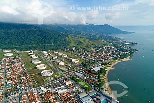 Foto feita com drone do Terminal Petroquímico da TRANSPETRO - subsidiária da PETROBRAS - no Porto de São Sebastião com a Ilhabela ao fundo - São Sebastião - São Paulo (SP) - Brasil