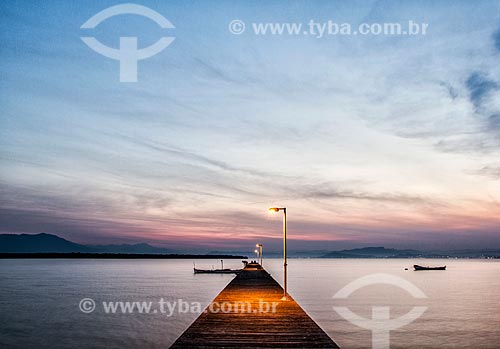 Silhueta de casal sobre trapiche na Lagoa da Conceição ao anoitecer - Florianópolis - Santa Catarina (SC) - Brasil