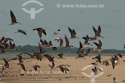 Assunto: Talha-mares (Rynchops niger cinerescens) e trinta-réis-grandes (Phaetusa simplex) voando / Local: Praia do Tapiira - Rio Japurá - Reserva de Desenvolvimento Sustentável Amanã - Amazonas - AM - Brasil / Data: 2007