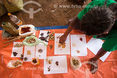 Sementes disponíveis para troca na Feira de troca de sementes da Aldeia Moikarakô - Terra Indígena Kayapó - com a participação de outras tribos e etnias - São Félix do Xingu - Pará (PA) - Brasil
