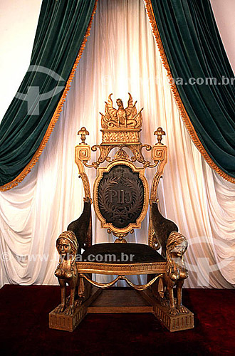 Trono de Estado(1) - Museu Imperial (2) - Região serrana do estado do estado do Rio de Janeiro - RJ - Brasil (1) O trono, que pertenceu ao Paço de São Cristóvão, é de cedro dourado e veludo verde; possui duas esfinges nos pés dianteiros, um dragão no alto do espaldar e, bordado a prata, a sigla P 2º I (Pedro Segundo Imperador) entre duas palmas. (2) Antigo Palácio Imperial de veraneio, encomendado por D. Pedro II e concluído em 1874 foi transformado em museu por decreto do Presidente Getúlio Vargas em 1939. É Patrimônio Histórico Nacional desde 23-09-1954. - Petrópolis - Rio de Janeiro - Brasil