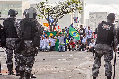 •  Manifestantes e a Polícia Militar durante a manifestação contra o governo de Michel Temer na Esplanada dos Ministérios  - Brasília - Distrito Federal (DF) - Brasil