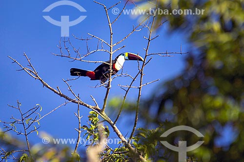 • Detalhe de tucano-de-peito-branco (Ramphastos tucanus) próximo de pequena comunidade ribeirinha - Parque Nacional de Anavilhanas - Manaus - Amazonas (AM) - Brasil