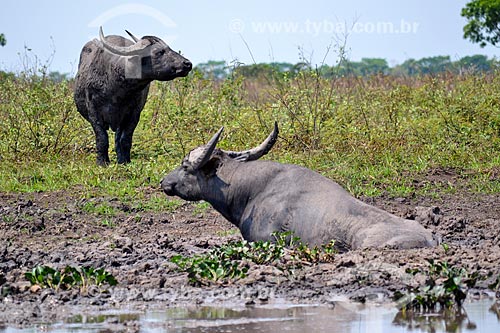 Búfalos às margens do Rio Guaporé proximo à Fazenda Pau DÓleo e da Reserva Biológica do Guaporé - São Francisco do Guaporé - Rondônia (RO) - Brasil