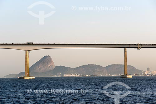 •  Vista da Ponte Rio-Niterói (1974) durante travessia na Baía de Guanabara com o Pão de Açúcar ao fundo  - Rio de Janeiro - Rio de Janeiro (RJ) - Brasil