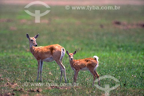 (Ozotocerus bezoarticus) Veado-campeiro com filhote - Pantanal Matogrossense - MT - Brasil A área é Patrimônio Mundial pela UNESCO desde 2000. - Mato Grosso - Brasil