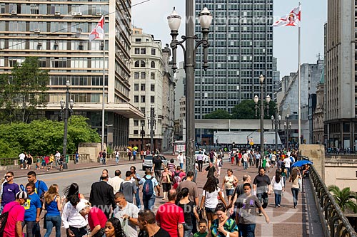 •  Movimento de pedestres no Viaduto do Chá numa segunda feira ao fundo Praça do Patriarca  - São Paulo - São Paulo (SP) - Brasil