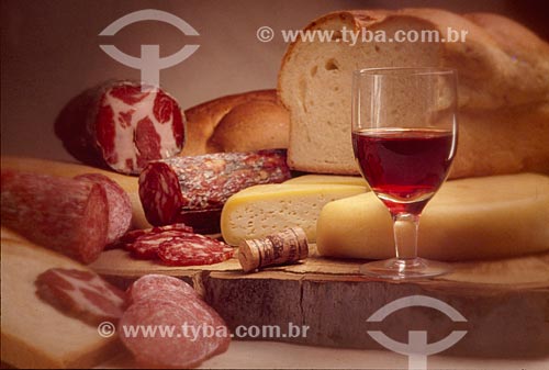 Detalhe de queijo e vinho com lareira ao fundo - Canela - Rio Grande do Sul (RS) - Brasil