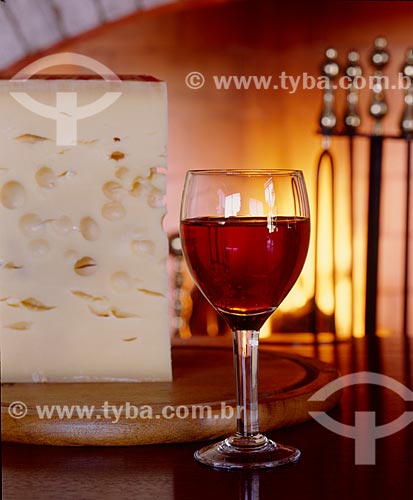 •  Detalhe de queijo e vinho com lareira ao fundo  - Canela - Rio Grande do Sul (RS) - Brasil