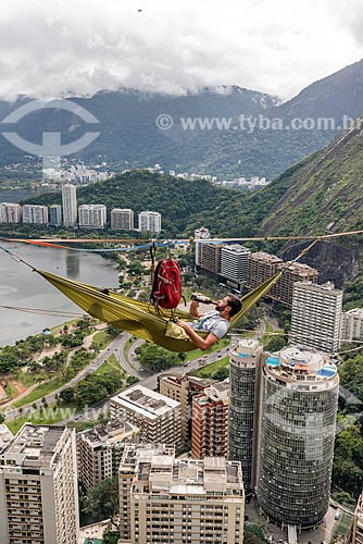 Homem deitado na rede em fita de slackline com uma garrafa de vinho no Morro do Cantagalo com a Lagoa Rodrigo de Freitas ao fundo - Rio de Janeiro - Rio de Janeiro (RJ) - Brasil