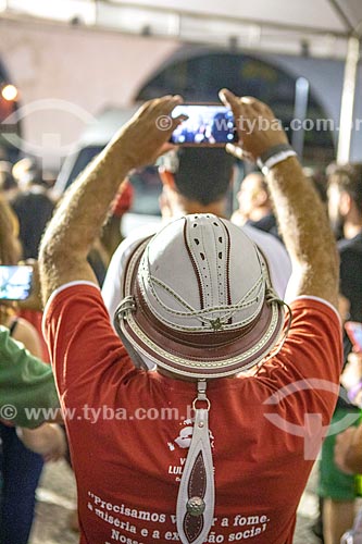 Homem com celular usando chapéu de couro estilo vaqueiro durante o comício Ato da Virada com Fernando Haddad - candidato à presidência pelo Partido dos Trabalhadores (PT) - Rio de Janeiro - Rio de Janeiro (RJ) - Brasil