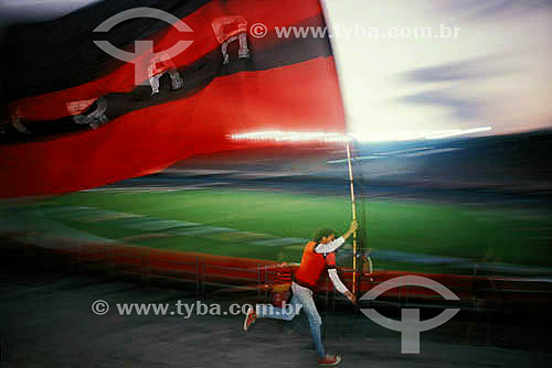 Subject: Soccer game - fan running with the Flamengo Football Club flag - Maracana Stadium - Rio de Janeiro city - Rio de Janeiro state - Brazil / Place: Rio de Janeiro city - Rio de Janeiro state (RJ) - Brazil
