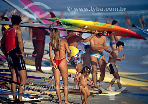 Subject: People at the beach and surfers (windsurf) with their boards