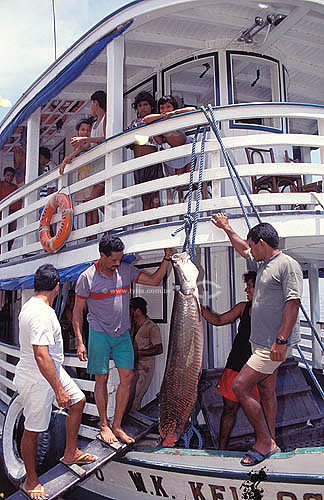 Subject: Amazonian Inhabitants - Fishermen on a boat exhibiting a Pirarucu Arapaima gigas recently fished - Negro River - Amazonas state - Brazil