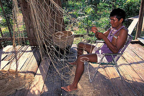 Subject: Man patching a hammock - Jaraua community - Mamiraua Reserve of Sustainable Development - Amazonas State - Brazil