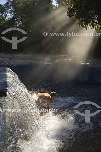 Subject: Man taking a bath in a waterfall in Brasilia national park - Brasilia city - Federal district - Brazil - august 2005
