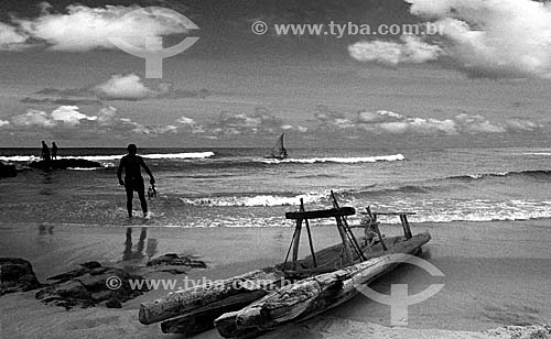 Subject: Fisherman holding fish and "jangadas" (a kind of raft, a typical boat of the Brazilian northeast) on Itapoa Beach - Salvador city - Bahia state - Brazil