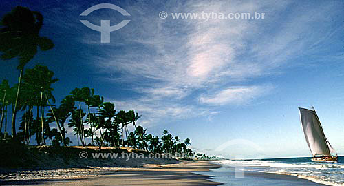 Subject: Itapoa Beach with Coconut palms and "saveiro" (a typical sailing boat of the Brazilian northeast) - Salvador city - Bahia state - Brazil