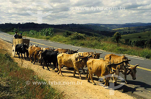 Subject: Men in a ox cart on the road - Minas Gerais state - Brazil