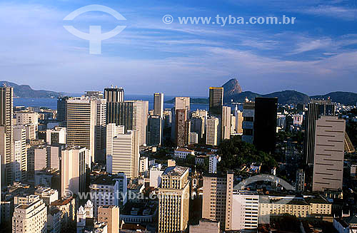 Subject: Aerial view of Rio de Janeiro city downtown with buildings in foreground and Pão de Açúcar (Sugar Loaf) in the background - Rio de Janeiro city - Rio de Janeiro state - Brazil