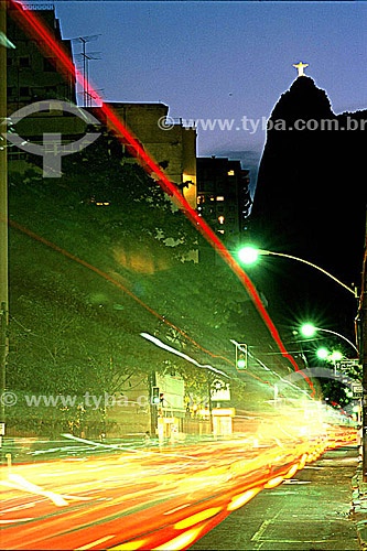 Subject: Stop-motion effect of the lights of cars as they drive along Rua Sao Clemente in the Botafogo district, with Cristo Rendentor (Christ the Redeemer) in the upper right at twilight - Rio de Janeiro city - Rio de Janeiro state - Brazil