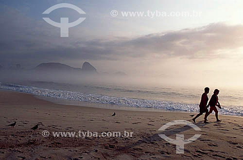 Subject: Silhouette of two persons walking at Copacabana Beach with the Sugar Loaf Mountain in the background - Rio de Janeiro city - Rio de Janeiro state - Brazil