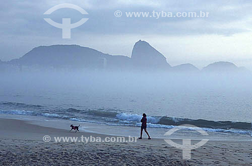 Subject: Woman and dog walking at Copacabana Beach with the Sugar Loaf Mountain in the background - Rio de Janeiro city - Rio de Janeiro state - Brazil