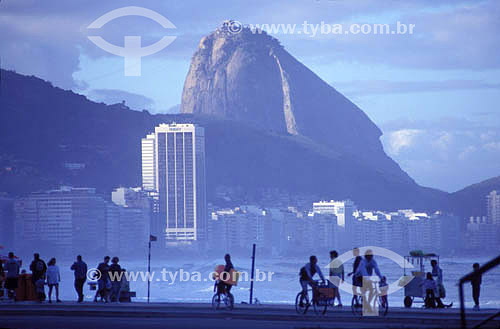 Subject: Silhouette of people on Copacabana Promenade and bicycle path with part of Sugar Loaf Mountain* above the buildings in the background - Rio de Janeiro city - Rio de Janeiro state - Brazil * Commonly called Sugar Loaf Mountain, the entire rock forma