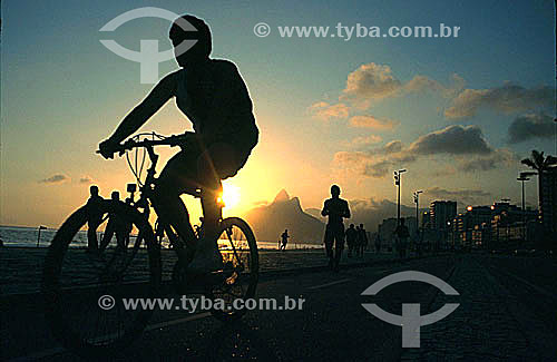 Subject: Silhouettes of a cyclist and people walking and jogging on the bicycle path on Ipanema Beach at sunset, with Morro Dois Irmãos (Two Brothers Mountain) in the background - Rio de Janeiro state - Brazil / Place: Ipanema -