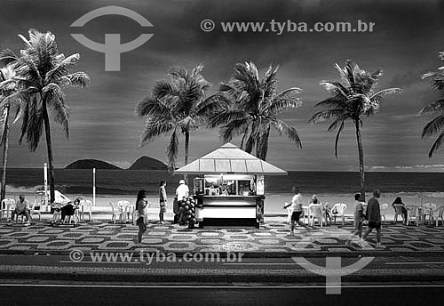 Subject: View of the Ipanema Beach with the people walking on the promenade - Coconu trees and stand - Rio de Janeiro city - Rio de Janeiro State - Brazil