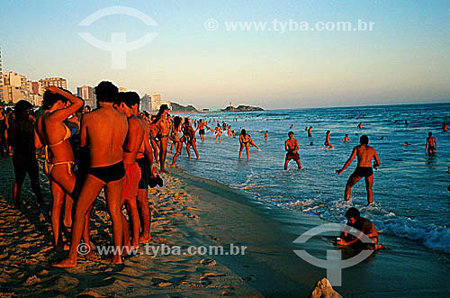 Subject: Young people talking, playing paddle ball and swimming on Ipanema Beach just before sunset - Rio de Janeiro city - Rio de Janeiro state - Brazil / Place: Ipanema -