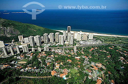 Subject: Aerial view of the neighborhood of São Conrado and Fashion Mall to the right - Rio de Janeiro city - Rio de Janeiro state - Brazil