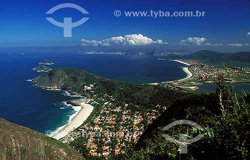 Subject: Itacoatiara beach seen from "Morrao" (Big Hill) with Camboinhas and Piratininga beaches and Rio de Janeiro city in the background - Niteroi city - Rio de Janeiro state - Brazil - July 2002