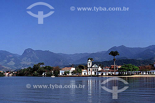 Subject: The city of Parati (1) as seen from Parati Bay showing the Igreja de Santa Rita dos Pardos Libertos (2) (Santa Rita dos Pardos Libertos Church) - Costa Verde (Green Coast) - Rio de Janeiro state - Brazil (1) The historic colonial city of Parati dat