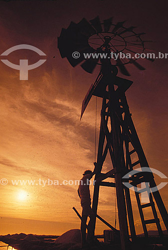 Subject: Worker in a saline with a windmill typical to the region - Cabo Frio city - Costa do Sol (Sun Coast) - Regiao dos Lagos (Lakes Region) - Rio de Janeiro state - Brazil