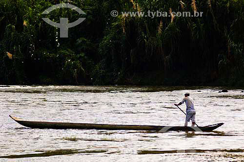 Subject: Man crosses "Ribeira" river on a tree trunk canoe - "Quilombo Ivaporunduva" - "Ribeira valley" - Eldorado - São Paulo state - Brazil