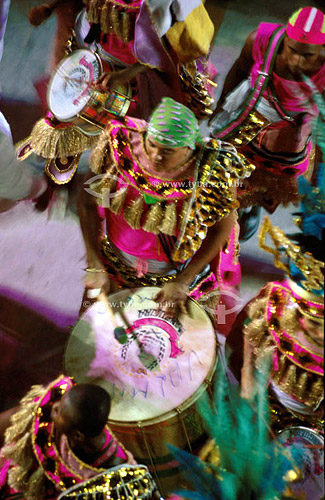 Subject: Bateria (drum section) - in the parade of the Mangueira Samba School during Carnival 2003 at Marquês de Sapucai - Sambodromo - Rio de Janeiro city - Rio de Janeiro state - Brazil