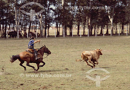 Subject: Cowboy to the horses with steer in the test of long bow at the roundup rodeo