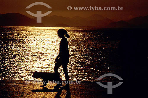 Subject: Silhouette of a woman and a dog walking in the sidewalk