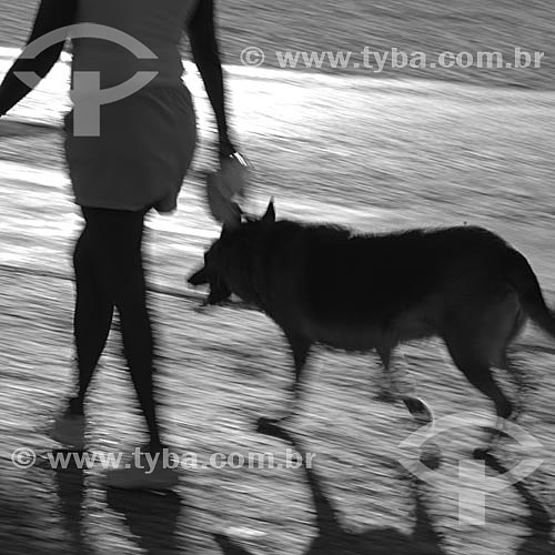 Subject: Leisure - woman walking with the dog along the promenade - Rio de Janeiro city - Rio de Janeiro state - Brazil