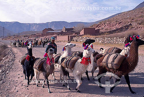 Subject: Pack of Llamas carrying maize on the road Potosi - Potosi Department - Bolivia