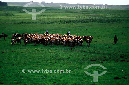 Subject: Agro-cattle-raising / cattle-raising : cattle herds on the prairies, driven by gauchos in traditional attire, Alegrete city, Rio Grande do Sul state, Brazil