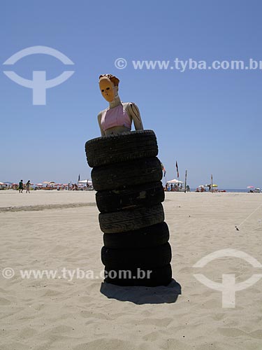 Subject: Manifestation against violence at Copacabana Beach, organized by Rio de Paz (Peace in Rio - NGO). Masked mannequins inside a pile of tires represent thousands of people that are vanished in Rio de Janeiro / Place: Rio de Janeiro city - Brazil