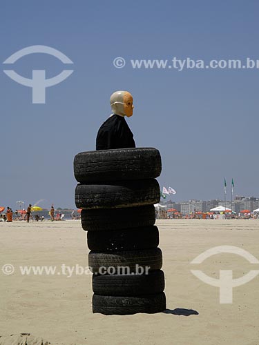 Subject: Manifestation against violence at Copacabana Beach, organized by Rio de Paz (Peace in Rio - NGO). Masked mannequins inside a pile of tires represent thousands of people that are vanished in Rio de Janeiro / Place: Rio de Janeiro city - Brazil