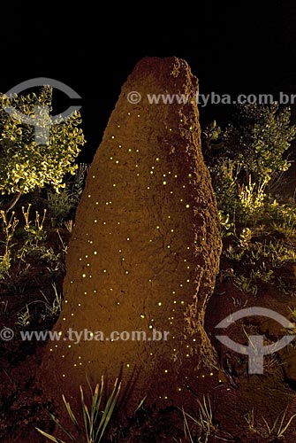 Subject: Termite mound with bioluminecense - larvae of the click-beetle Pyrearinus termitilluminans - on humid nights, warm, moonless and no wind, larvae appear on the outside of the tunnel, "lit", attracting small insects to prey them / Place: Mineiros city - Goias state (GO) - Brazil
