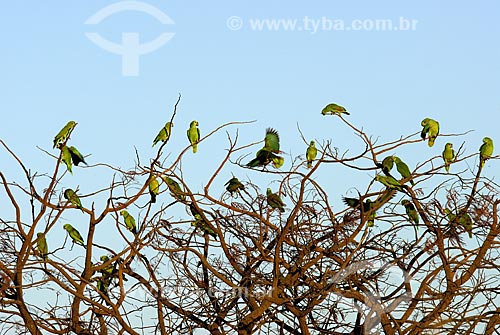 Subject: Blue-fronted Amazon (Amazona aestiva), also called the Turquoise-fronted Amazon and Blue-fronted Parrot gathered in the tree in late afternoon at Emas National Park / Place: Goias state - Brazil / Date: 10/08/2006