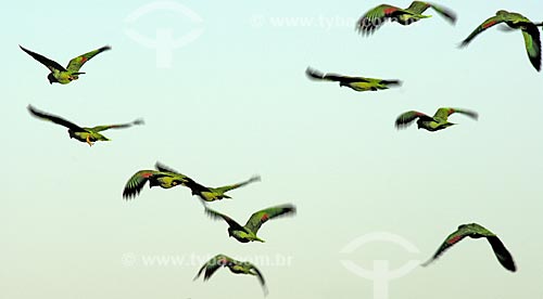 Subject: Blue-fronted Amazon (Amazona aestiva), also called the Turquoise-fronted Amazon and Blue-fronted Parrot flying together in late afternoon at Emas National Park / Place: Goias state - Brazil / Date: 10/08/2006