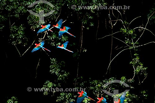Subject: Red-and-green Macaw (Ara chloropterus) flying / Place: Jardim city - Mato Grosso do Sul state (MS) - Brazil / Date: 10/2010